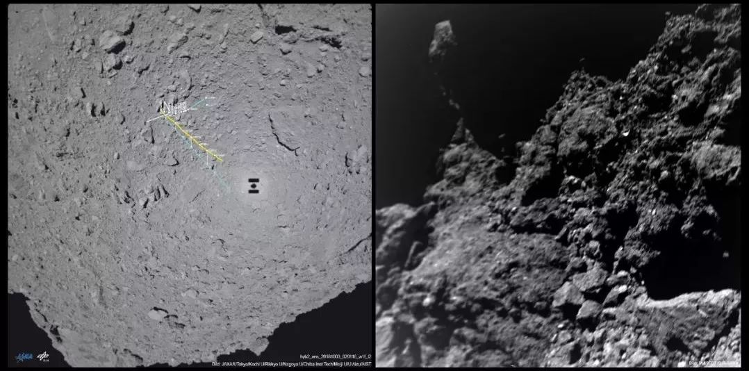 (左)MASCOT的着陆路径,(右)MASCOT快要着陆时拍摄的“龙宫”表面。可以看到“龙宫”表面凹凸不平,而且都是坚硬的石块。来源:JAXA、DLR