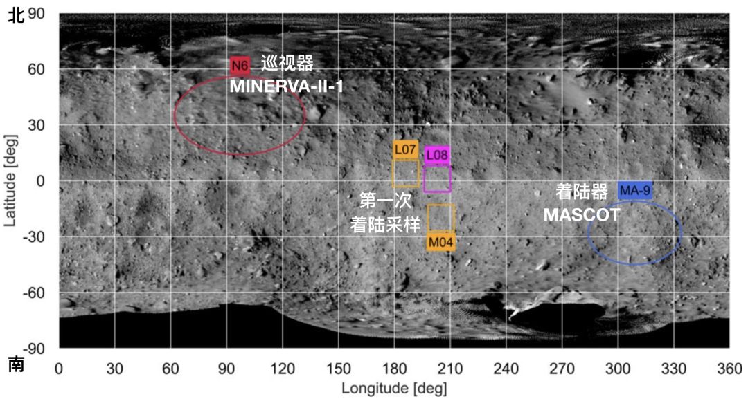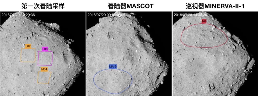 选定的着陆点位置,其中L和M分别表示低纬度和中纬度。别忘了小行星“龙宫”的直径只有约900米,所以正方形框的边长只有约100米。来源:JAXA、东京大学等