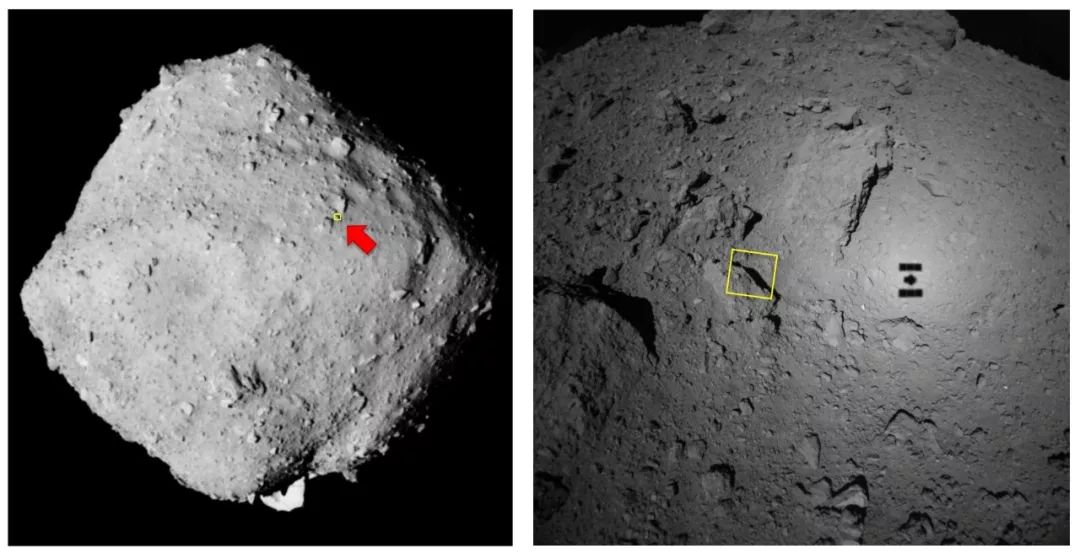 ↓ 拍摄的区域是红色箭头所指的黄框中的范围,而且……隼鸟2号还拍到自己的影子!