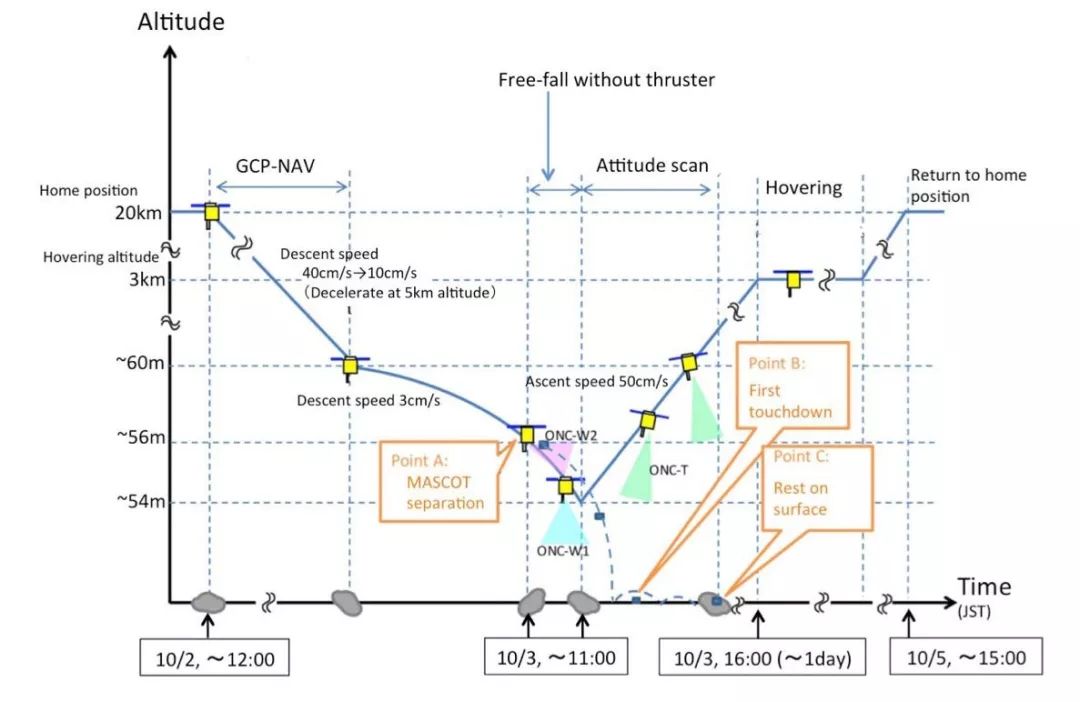 10月2日,隼鸟2号开始下降,并在北京时间10月3日降落到距离龙宫表面约51米近的高度后(北京时间10时左右)释放MASCOT,不久后隼鸟2号再次上升,不过这次,隼鸟2号并不会直接一口气上升到20公里处,而是会在“龙宫”上空2.5公里处悬停一段时间(下图中的hovering段)跟踪观察MASCOT。