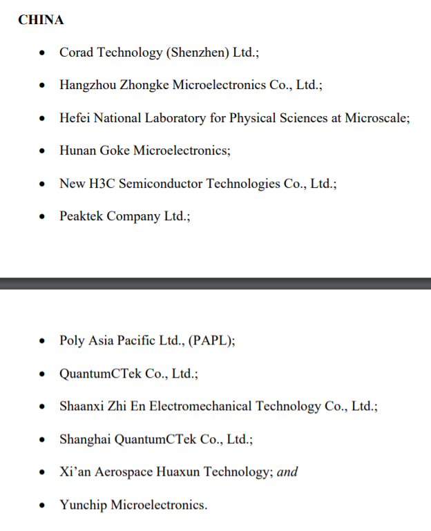 嘉兆科技(深圳)有限公司嘉兆科技有限公司从1980年创立以来,致力于为政府、科研机构、院校和厂商引进国外先进电磁兼容、微波测试、无线通讯、数据采集等方面的测试仪器和射频微波器件。嘉兆科技通过提供全面的本地应用支持,从而降低离岸成本并增加便利性,从而为全球 ATE 行业提供独特的产品。提供内部(非外包)设计、PCB 制造、元件采购、元件组装、Seica 测试、模拟和探针头组装服务。杭州中科微电子有限公司杭州中科微电子有限公司是国家高新技术企业和国家工信部认定的集成电路设计企业。公司坚持以人为本的经营理念,秉承"科技使生活更美好"的理念,坚持"用芯改变生活"的务实作风,营造"诚信、敬业、求实;合作、奋斗、创新"的企业文化与工作方法,不断培养和激发员工的学习力、想象力、创造力、战斗力。合肥微尺度物质科学国家研究中心合肥微尺度物质科学国家研究中心(以下简称微尺度国家研究中心)是科技部2017年11月批准组建的六个国家研究中心之一,依托于中国科学技术大学,是在合肥微尺度物质科学国家实验室筹建十余年的基础上组建。微尺度国家研究中心通过整合物理、化学、材料、生物和信息这五个一级学科的研究力量,在学科交叉与融合的基础上,形成一个以多学科综合为特点、以国家重大战略需求和交叉前沿领域为导向的新型基础科学研究中心。湖南国科微电子股份有限公司国科微电子股份有限公司成立于2008年,是国家规划布局内的重点集成电路设计企业,国家知识产权示范企业。国科微长期致力于存储、智能机顶盒、视频编解码、物联网等领域大规模集成电路及解决方案开发。公司每年将营业收入的20%以上用于研发,先后承担了国家科技重大专项、国家重点研发计划等一系列重大科研项目,在先进工艺制程的芯片及其终端产品上积累了大量知识产权,具备了快速研发及量产SoC芯片能力。新华三半导体技术有限公司紫光旗下新华三集团作为数字化解决方案领导者,致力于成为客户业务创新、数字化转型值得信赖的合作伙伴。新华三拥有计算、存储、网络、5G、安全等全方位的数字化基础设施整体能力,提供云计算、大数据、人工智能、工业互联网、信息安全、智能联接、新安防、边缘计算等在内的一站式数字化解决方案,以及端到端的技术服务。同时,新华三也是HPE®服务器、存储和技术服务的中国独家提供商。Peaktek Company Ltd.宝利亚太有限公司 Poly Asia Pacific Ltd. (PAPL)科大国盾量子技术股份有限公司科大国盾量子技术股份有限公司成立于2009年,公司是中国量子信息产业化的开拓者、实践者和引领者,主要从事量子保密通信产品的研发、生产、销售及技术服务,并前瞻布局量子计算等领域科研仪器的研发、生产和集成服务。公司践行“量子科技 产业报国”理念,推动产学研用协同创新。公司技术起源于中国科学技术大学,目前已逐步成长为全球少数具有大规模量子保密通信网络设计、供货和部署全能力的企业之一。公司为各类光纤量子保密通信网络以及“星地一体”广域量子保密通信网提供软硬件产品,推动量子保密通信网络和经典通信网络的无缝衔接,为政务、金融、电力、国防等各行业和领域的客户提供量子安全应用解决方案。上海国盾量子技术股份有限公司陕西智恩机电科技有限公司陕西智恩机电科技股份有限公司是一家集选冶技术、分析测试、环保工艺、产品研发、进出口贸易、工程项目为一体的综合性创新型企业,旗下包括矿业开发、环保事业、 贸易、工程项目四大板块。拥有自主研发矿虫环保提金剂、矿虫环保抑制剂、铜铅抑制剂、絮凝剂四大药剂产品以及自动取样设备、自动加药设备等自动化产品。目前已转化专利技术10余项,已完成研发正在申请的专利技术50余项,自主商标十余个。西安航天华迅科技有限公司西安航天华迅科技有限公司,是一家设计、研发、量产和销售GPS导航芯片的企业,也是中国北斗芯片产业领域主要的开拓者和领导者。主要从事GPS/北斗导航芯片和模块的设计、开发、生产和销售以及相关行业北斗导航应用系统解决方案的策划、制定和实施,是目前国内GPS/北斗核心芯片和模块的主要供应商之一。航天华迅已先后成功设计、研发和量产了四代十多款导航核心芯片,产品性能均达到国际先进水平。目前,公司正加紧研发最新一代高性能、低功耗、低成本的北斗/GPS双模导航定位射频、基带芯片,以及面向智能手机应用的基于40nm先进工艺技术的北斗/GPS+Bluetooth/WiFi/FM五合一集成SOC芯片。苏州云芯微电子科技有限公司苏州云芯微电子科技有限公司成立于2010年,致力于高速高精度数据转换器芯片和集成中射频、模拟、数字功能的集成芯片(SOC/SIP)的正向设计、开发、生产、销售。公司研发团队掌握高速高精度数据转换器芯片设计核心技术,拥有为国内企业提供定制化芯片开发设计的丰富经验。产品涵盖高性能模数转换器芯片(ADC)、数模转换器芯片(DAC)、直接数字式频率合成芯片(DDS)、正交数字上变频芯片(QDUC)、多频多模射频收发芯片(SOC/SIP)等多个门类。公司产品广泛应用于通信、测控等领域。参考资料:https://www.scmp.com/news/china/article/3157288/12-more-chinese-companies-are-placed-us-export-blacklisthttps://www.commerce.gov/news/press-releases/2021/11/commerce-lists-entities-involved-support-pr