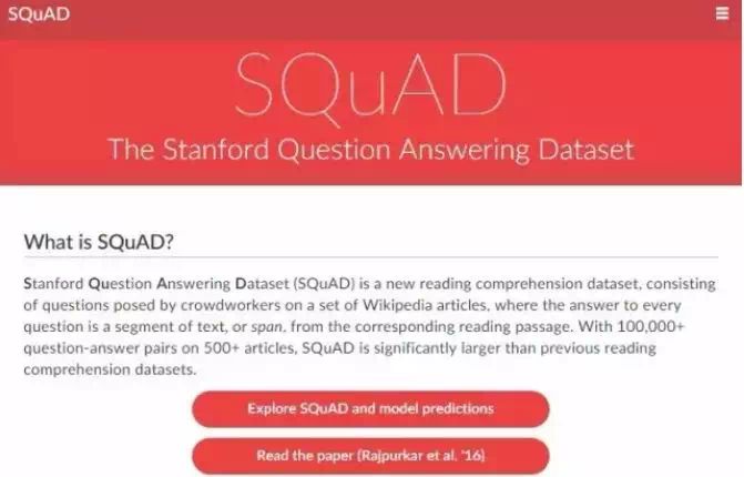 SQuAD 的全称是斯坦福问答数据集 (Stanford Question Answering Dataset),是由斯坦福大学自然语言处理实验室开发的数据集和比赛。SQuAD 的数据来自 Wikipedia 的文章。数据标注人员去掉了文章里的一些单词,并让参赛队伍利用模型重新填空,借以检测模型对文章的理解程度