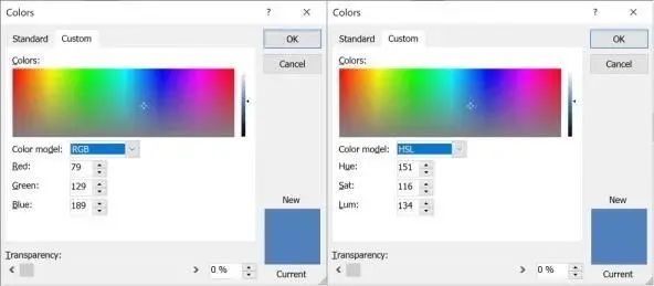 例如,在 HSL 中选择一个蓝色,然后将亮度降低到 0,并切换到 RGB 显示,正确显示为 0,0,0。把 R 增加一点,然后再设置为 0,再切换回 HSV,现在显示的是色调和饱和度为 0,当然,这应该是未定义的。色调为 0 意味着红色,但黑色没有色调。色彩区域的指针仍然显示最初选择的蓝色,而不是色调为 0 的红色。这不仅让我感到困惑,而且当我不断地鼓捣黑色、灰色和白色,并在 RGB 和 HSL 视图之间切换时,我的 PowerPoint 终于崩溃了。