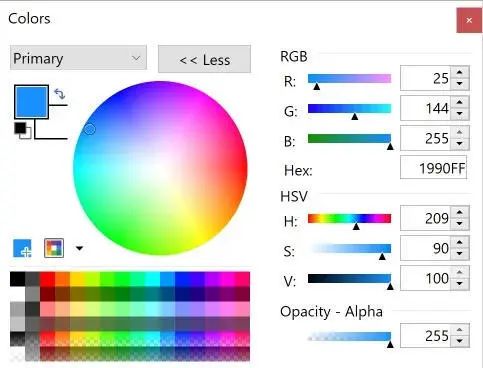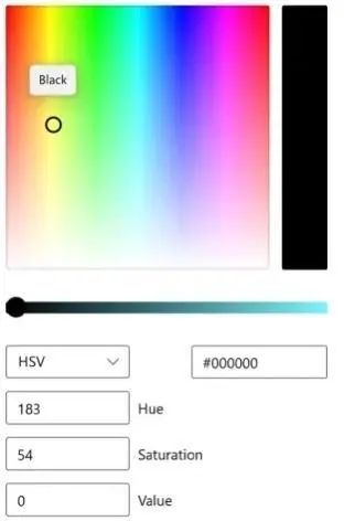 它的工作原理有点像 PowerPoint 中的取色器,但使用 HSV(HSB)代替,这意味着色彩区域的下部是白色的,而不是灰色的。下方的滚动条改变 V 值(亮度)。当设置为黑色时,色调和饱和度保持其最新值,即使后来在色彩区域选择了不同的色彩也一样。当值(亮度)增加时,色彩区的圆圈就会跳回原来的色调。这样很奇怪,但至少没有崩溃。