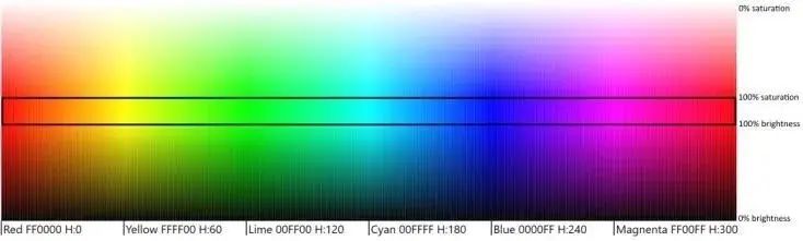 现在我们可以再画一次彩虹,加入一些饱和度和亮度的变化。X 轴增加了从 0 到 360 的色调。在中间的是以 100% 的饱和度和 100% 的亮度显示的每个色调。在上半部分,亮度保持在 100%,饱和度降低到 0%,这就形成了白色。在下半部分,饱和度保持 100%,亮度减少到 0%,这就形成了黑色。