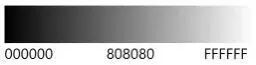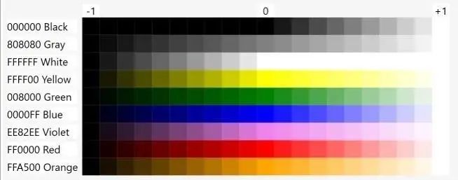 注意:对于灰色(即 R、G 和 B 有相同的值),色调和饱和度都没有定义,只有亮度有意义的值。我们也可以说,黑色、灰色和白色都不是色彩。黑色 0000 的亮度为 0,白色 FFFFF 的亮度为 1。仅靠亮度来控制白色、灰色和黑色的外观有一个奇怪的后果,我们可以在下一张图中看到。