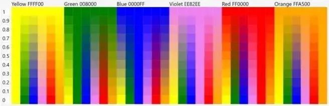 这就是生成良好匹配的色彩所需要的一切操作。第一张图片显示了每种“主”色如何与其他“主”色进行不同程度的混合,同样是红、绿和蓝: