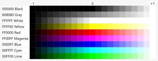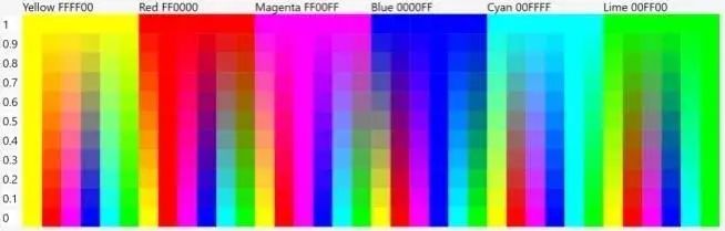 注意黄色、青色和品红在变成白色或黑色之前比其他色调能保持更长时间。它们是最强的色彩,因为有 2 个点在全亮度闪耀。