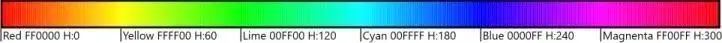 左边和右边边界的色彩是红色。由于这个原因,彩虹常常被画成一个圆形。色调是以度数来定义的,红色为 0 和 360 度。