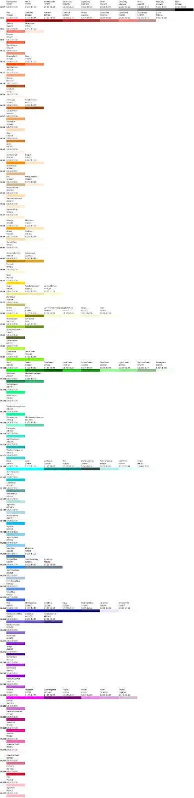 所以我花了一些时间,按色调垂直排序,然后按亮度和饱和度水平排序。这里的结果列出了与 Colors 帮助页面中完全相同的色彩: