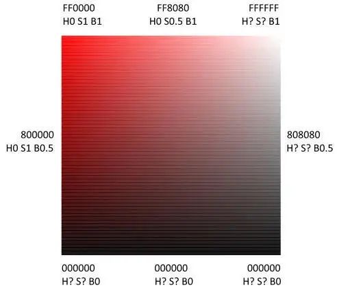 我想这是本文中最令人困惑的图片。基本上,我想把 Y 轴(从上到下)上的色彩从红色变成黑色,意味着亮度从 1 到 0,而 X 轴(从左到右)上的色彩从红色变成白色,意味着饱和度从 1 到 0,我本来以为白色和黑色也会混合,右下角会变成灰色,但情况并非如此。只要 R、G、B 有相同的值,色调和饱和度就失去了意义。只有亮度对白色、灰色和黑色(右边界)的色彩有影响。更糟糕的是整个下边界只有黑色,因为一旦亮度为 0,色调和饱和度又变得毫无意义了。