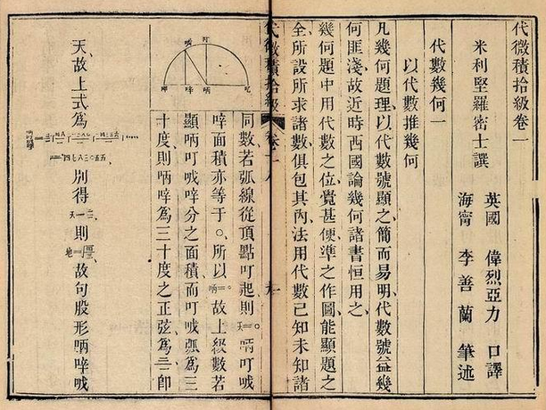 李善兰在1859年与英国传教士Alexander Wylie合作,翻译了Elias Loomis的「Elements of Analytical Geometry and of the Differential and Integral Calculus」(1850)。