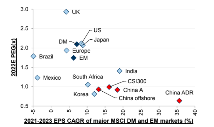 据高盛测算,2021-2023年,中国A股EPS的CAGR在15%-20%之间,远高于欧美日韩等市场,但是其PEG(市盈率相对盈利增长比率)却低于1,远不及上述市场。