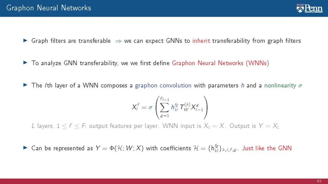 在这节课中,我们将讨论GNN的可迁移性,也就是说能够在保证性能的情况下迁移机器学习模型。首先,我们深入研究了谱域和节点域的graphon滤波器的收敛性。稍后,我们将以生成模型的形式讨论graphon过滤器。我们将继续介绍graphon 神经网络(WNNs),这是解释为什么graphon 神经网络可以在从graphon 获得的确定性图之间转换的关键元素。我们最后证明GNN继承了图滤波器的可迁移性。