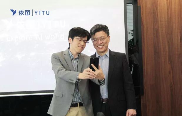 2018年4月,微软全球执行副总裁沈向洋(右)访问依图。依图科技联合创始人、CEO朱珑(左)曾在微软亚洲研究院(MSRA)研发人脸识别算法,导师就是沈向洋。依图科技联合创始人林晨曦,业务技术副总裁吴岷,研发总监周健等也都来自MSRA。图片来源:依图科技