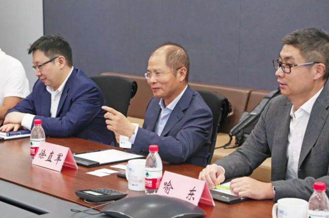 10月9日,华为轮值董事长徐直军(左二)、华为安平系统部总裁岳坤、华为企业BG行业Marketing与解决方案总裁喻东(左三)等一行到访依图。来源:依图科技