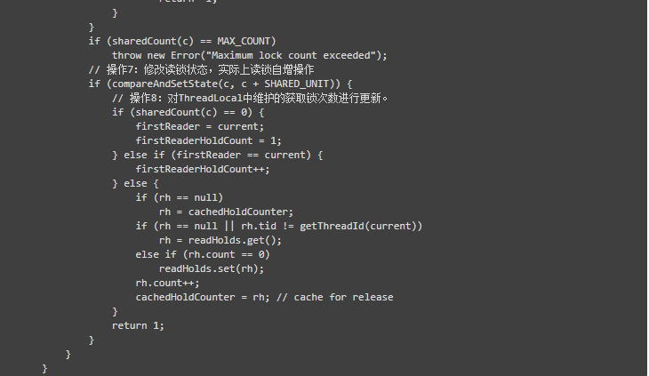 操作8:同操作4,获取成功后再ThreadLocal中记录当前线程获取读锁的次数。