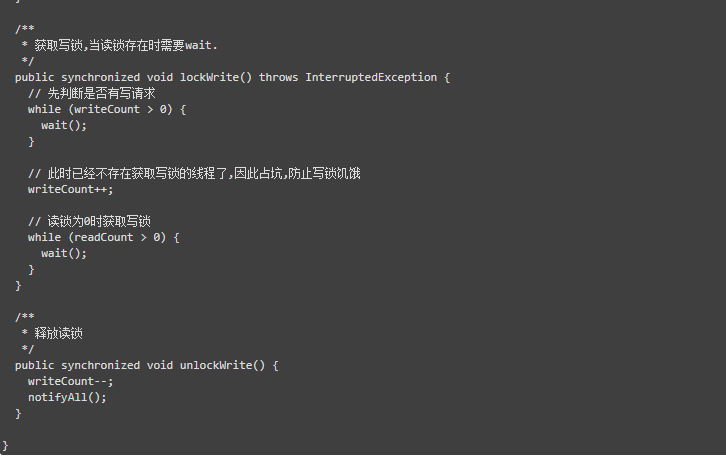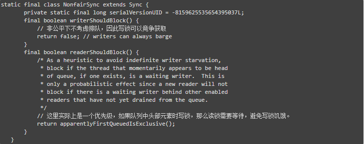非公平下由于抢占式获取锁,写锁是可能产生饥饿,因此解决办法就是提高写锁的优先级,换句话说获取写锁之前先占坑。
