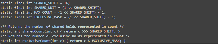 该图表示当前一个线程获取到了写锁,并且重入了两次,因此低16位是3,并且该线程又获取了读锁,并且重入了一次,所以高16位是2,当写锁被获取时如果读锁不为0那么读锁一定是获取写锁的这个线程。