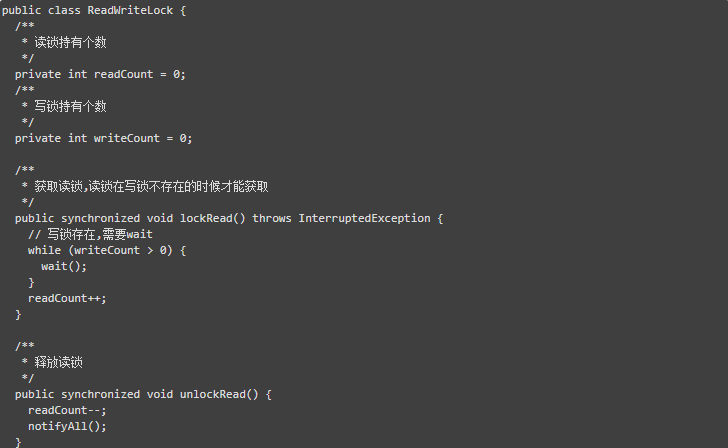 根据上面理论可以利用两个int变量来简单实现一个读写锁,实现虽然烂,但是原理都是差不多的,值得阅读下。