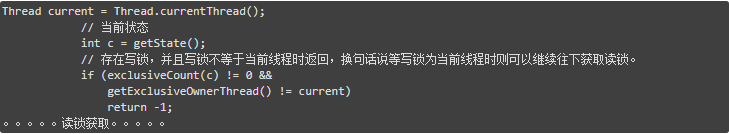 锁降级操作指的是一个线程获取写锁之后再获取读锁,然后读锁释放掉写锁的过程。在tryAcquireShared(arg)获取读锁的代码中有如下代码。