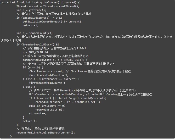 其中doAcquireShared(arg)方法是获取失败之后AQS中入队操作,等待被唤醒后重新获取,那么关键点就是tryAcquireShared(arg)方法,方法有点长,因此先总结出获取读锁所经历的步骤,获取的第一部分步骤如下: