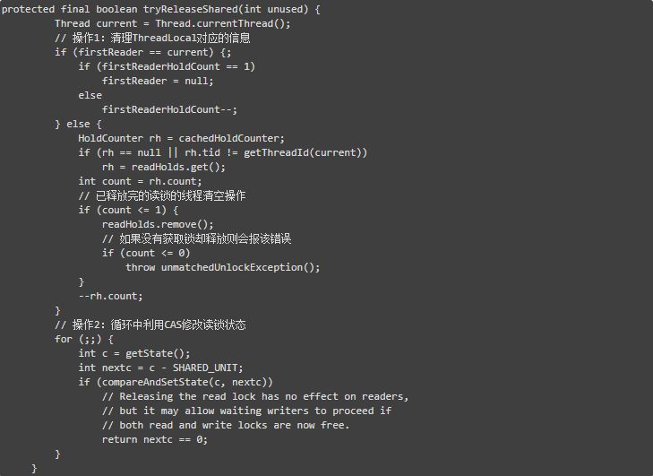 读锁的释放主要是tryReleaseShared(arg)函数,因此拆解其步骤如下: