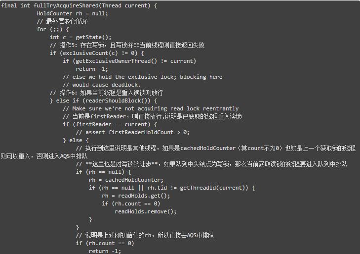 当操作2,操作3失败时会执行fullTryAcquireShared(current),为什么会这样写呢?个人认为是一种补偿操作,操作2与操作3失败并不代表当前线程没有读锁的资格,并且这里的读锁是共享锁,有资格就应该被获取成功,因此给予补偿获取读锁的操作。在fullTryAcquireShared(current)中是一个循环获取读锁的过程,大致步骤如下: