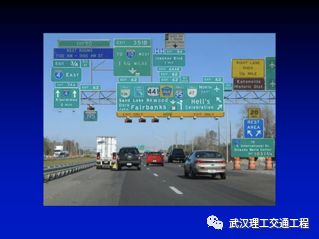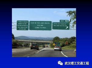 我拿这个做一个开场白,也是希望交通部也来看看,我们在做标志的时候想告诉世人什么东西,他得到了什么信息。因为你看这个接近只有三条车道,然后再往前走还分出去一个岛,是不是缺少信息。要是我来做这个标志呢,我就去用另一个方法做,会指示每一个车道是干什么的,是个三条车道,每一个箭头向下,这个也是零九年版美国联邦公路局发布的统一交通控制设施手册(MUTCD)的最重点的要求,其中有一点就是箭头应该怎么标。我也是一直想跟咱们国内的同行们说,我们在稍稍复杂一点的地方的,或者说即使不复杂的一个地方,我们应该告诉驾驶人每条车道是去哪儿,并不是说给他一个方向。驾驶人为什么容易犯错呢?他说,我走到这儿我只是个大方向是对的,但是我不一定知道我这个车道已经完全容纳不了,这就又牵扯到安全和效率,频繁换道的时候就容易产生事故,就是安全。