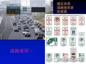 还有一个满足道路使用和管理,道路你怎么使用,是单向行驶,还是还可以停车,这个跟中国差不多了,这是国内的这个停车标志,这是美国的,美国当然也有红的,中国还没有这样的标志,这是允许停车的标志,允许你在这停一个小时,从早上7点到晚上6点允许你在这停一个小时,国内到现在还没有,因为一般比如你像咱们这个街道上小街小巷,那些小的这些商户,他希望人在这门口能停一会儿,但是又不能停长了,停长了影响另外的客户了。比如咱们那些卖快餐的,卖早点的,还有洗衣店,还有银行就希望你在这停一个小时之内,然后下一个客户来他还可以停。