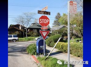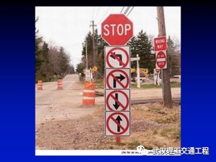 再一个像这种停车标志,必须是单独安装的,它可以底下安装一个,比如说不能左转,也可以安装在它的头顶上,可以安装交叉的照明,但是从理论上后边不能安装其他的,把它这个形状改变看不出来了。假设它某种程度颜色掉了,或者看不清了,形状还在。限速标志,绝对是只能单独安装,不能跟其他的混在一起。咱们中国的限速标志有什么120,100、80,太可怕了,一般来说,从交通工程的角度,让车在道路上开的差不多的速度都很困难,人为地把它分成这么多速度,我是一直持反对意见。