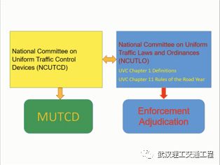 另外一边就是咱们做工程的人用的,从那一边下来就是到了统一交通工具手册MUTCD,两个内容是一定要一致的,比如说必须有红灯绿灯黄灯,但是这边是告诉你怎么执法的,怎么设置,这是两边的东西。