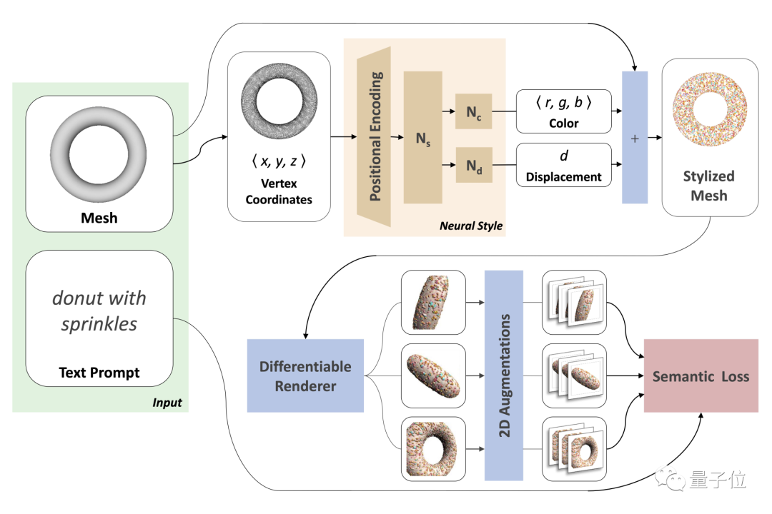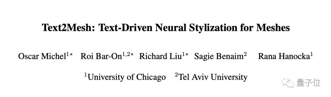 这就是用一个专门给3D物体“换皮肤”的模型Text2Mesh做出来的,由芝加哥大学和特拉维夫大学联合打造。