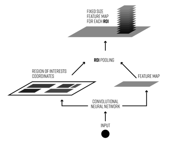 对于每个RoI而言,需要从共享卷积层获取的特征图上提取对应的特征,并且送入全连接层进行分类。因此,RoI Pooling主要做了两件事,第一件是为每个RoI选取对应的特征,第二件事是为了满足全连接层的输入需求,将每个RoI对应的特征的维度转化成某个定值。RoI Pooling示意图如下所示: