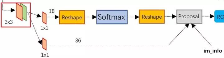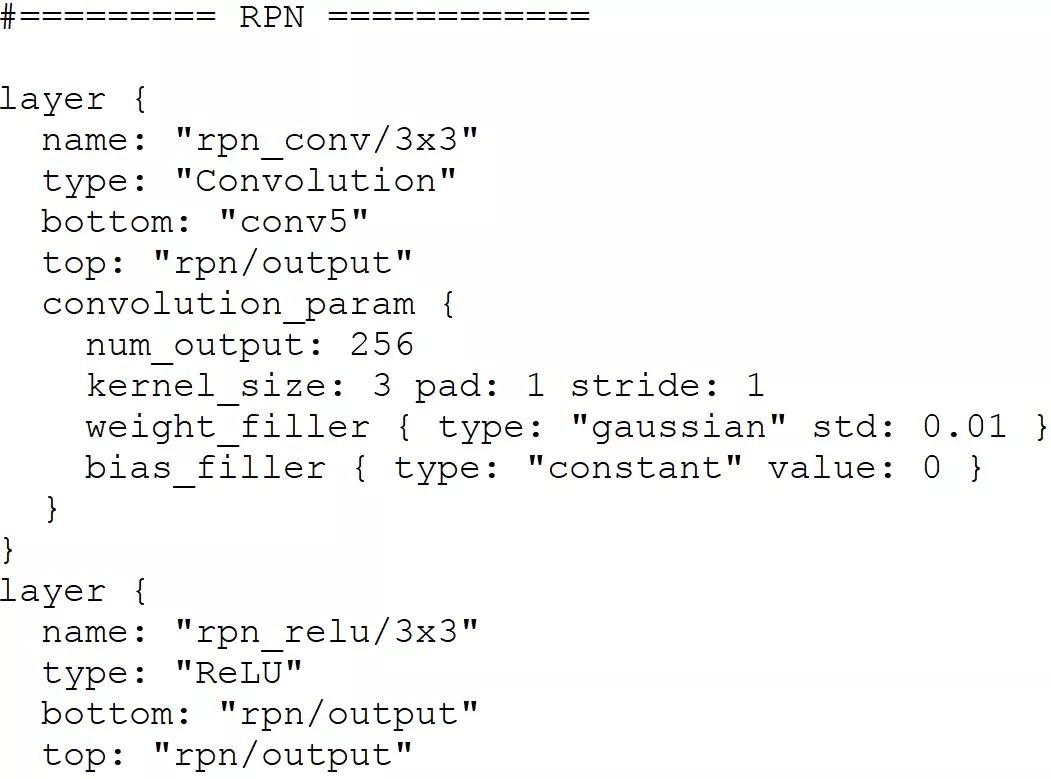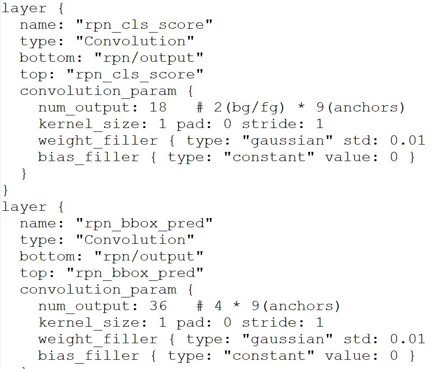 在得到每一个候选区域anchor A的修正参数之后,我们就可以计算出精确的anchor,然后按照物体的区域得分从大到小对得到的anchor排序,然后提出一些宽或者高很小的anchor(获取其它过滤条件),再经过非极大值抑制抑制,取前Top-N的anchors,然后作为proposals(候选框)输出,送入到RoI Pooling层。 那么,RPN怎么实现呢?这个问题通过RPN的本质很好求解,RPN的本质是一个树状结构,树干是一个3×3的卷积层,树枝是两个1×1的卷积层,第一个1×1的卷积层解决了前后景的输出,第二个1×1的卷积层解决了边框修正的输出。来看看在代码中是怎么做的: