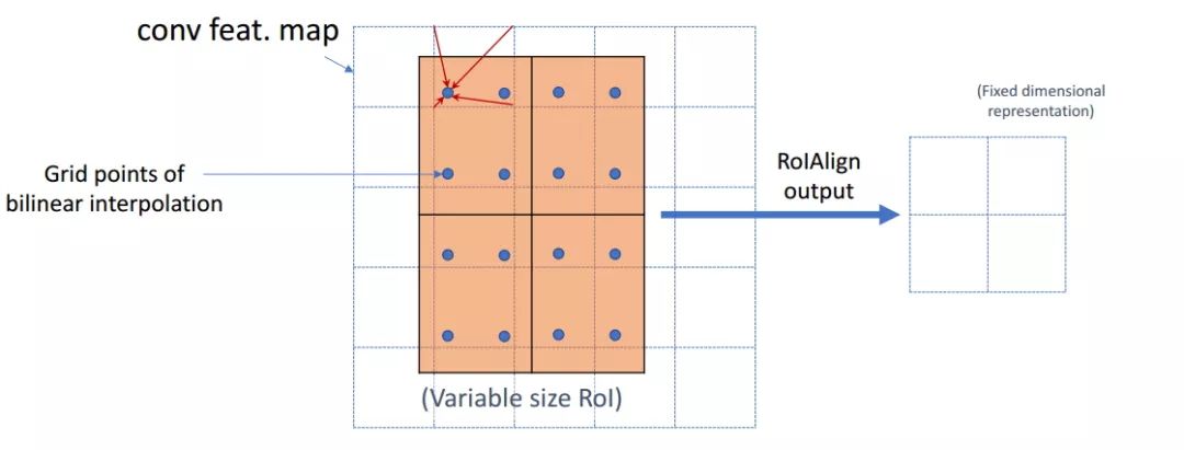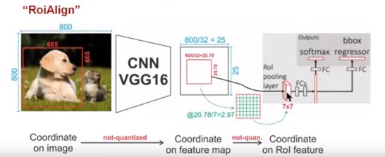 接着,对这些剩下的RoI进行RoIAlign操作(即先将原图和feature map的pixel对应起来,然后将feature map和固定的feature对应起来);
