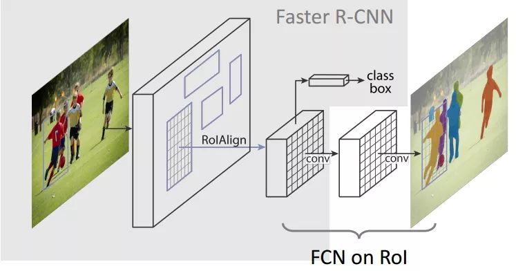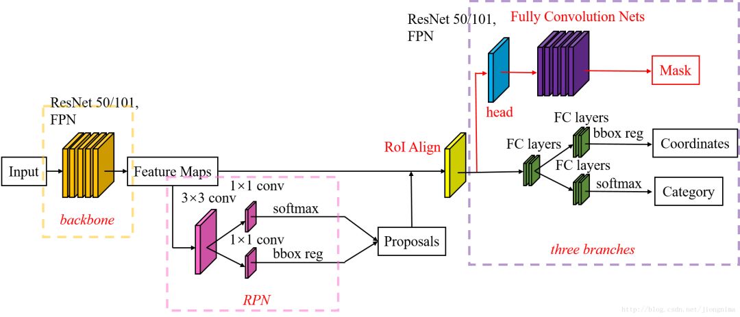 Mask R-CNN可以分解为如下的3个模块:Faster-RCNN、RoI Align和Mask。算法框架如下: