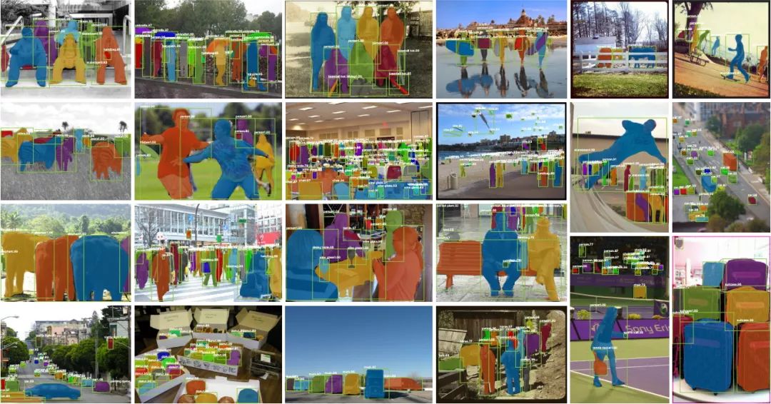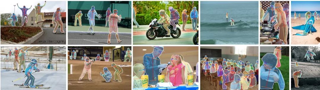 最后,对这些RoI进行分类(N类别分类)、BB回归和MASK生成(在每一个ROI里面进行FCN操作)。 Mask R-CNN是一个非常灵活的框架,可以增加不同的分支完成不同的任务,可以完成目标分类、目标检测、语义分割、实例分割、人体姿势识别等多种任务,如下图所示。