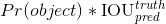 。边界框的准确度可以用预测框与实际框(ground truth)的IOU(intersection over union,交并比)来表征,记为