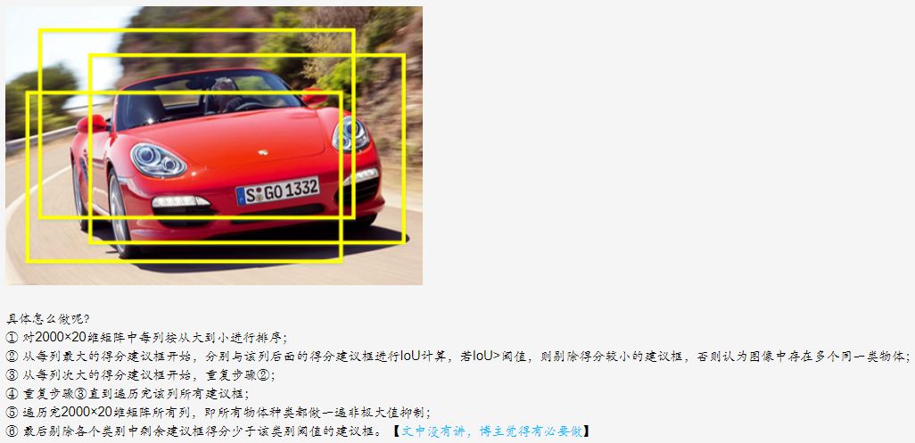 分别对上述2000×20维矩阵中每列即每一类进行非极大值抑制剔除重叠建议框,得到该列即该类中得分最高的一些候选框;