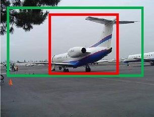 判断前景或背景:对于所有的anchors,首先需要判断anchor是是否为前景。对于第一个问题,RPN的做法是使用SoftmaxLoss直接训练,在训练的时候排除掉了超越图像边界的anchor;边框修正:如图绿色表示的是飞机的实际框标签(ground truth),红色的表示的其中一个候选区域(foreground anchor),即被分类器识别为飞机的区域,但是由于红色区域定位不准确,这张图相当于没有正确检测出飞机,所以我们希望采用一种方法对红色的框进行微调,使得候选区域和实际框更加接近: