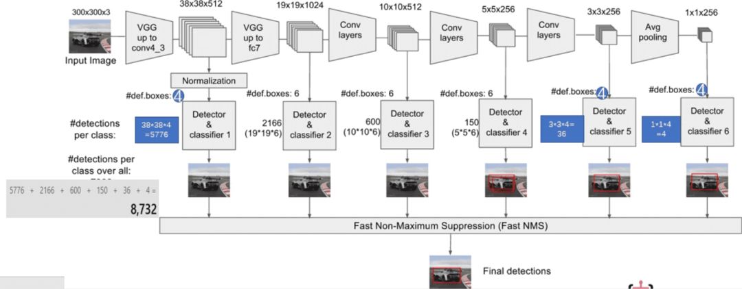 如上所示,在每个卷积层上都会进行目标检测和分类,最后由NMS进行筛选,输出最终的结果。多尺度feature map上做目标检测,就相当于多了很多宽高比例的bounding box,可以大大提高泛化能力。