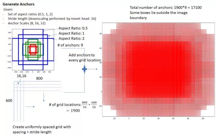 上图展示了RPN网络的具体结构。可以看到RPN网络实际分为2条支线,上面一条支线通过softmax来分类anchors获得前景foreground和背景background(检测目标是foreground),下面一条支线用于计算anchors的边框偏移量,以获得精确的proposals。而最后的proposal层则负责综合foreground anchors和偏移量获取proposals,同时剔除太小和超出边界的proposals。其实整个网络到了Proposal Layer这里,就完成了相当于目标定位的功能。anchor:简单地说,RPN依靠一个在共享特征图上滑动的窗口,为每个位置生成9种预先设置好长宽比与面积的目标框(即anchor)。这9种初始anchor包含三种面积(128×128,256×256,512×512),每种面积又包含三种长宽比(1:1,1:2,2:1)。示意图如下所示: