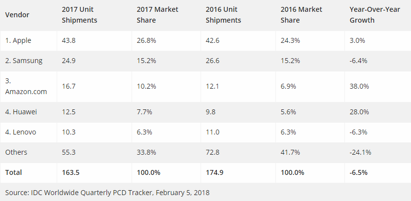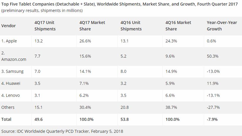 苹果在 2017 年总共销售了 4380 万部 iPad,IDC 估计三星和亚马逊年内分别出货 2490 万部和 1670 万部平板电脑。三星和亚马逊合计 4160 万台平板电脑,比 iPad 销售量低了 220 万台。