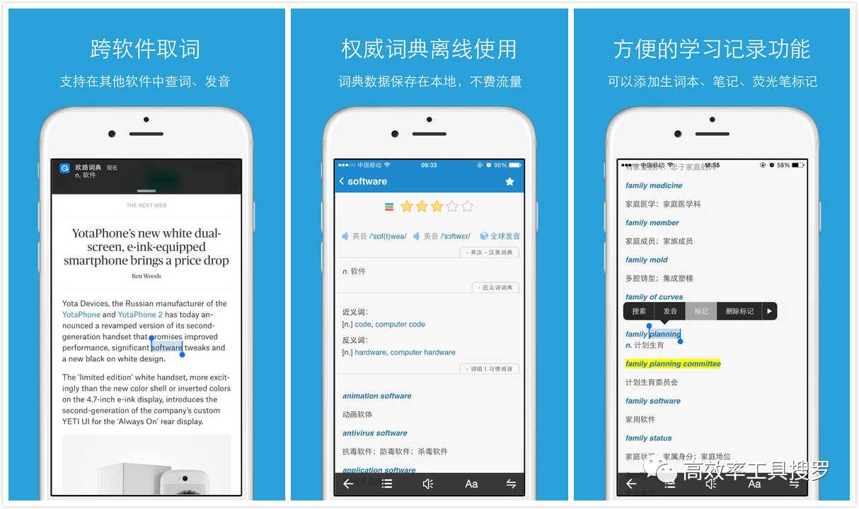 还支持自定义文件阅读,而且还支持PDF 取词功能,还提供真人发音,生词本还有在线同步功能,各个设备上保持一致。