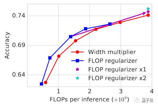 MorphNet方法则直接以算力消耗为目标,在收缩模型时生成更好的权衡曲线(蓝色)。