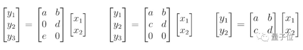 假设一个表示为矩阵乘法的神经网络层,该层具有 2 个输入(Xn),6 个权重(a, b, …, f)以及 3 个输出(Yn;神经元)。也就是说评估这一层需要 6 次乘法。