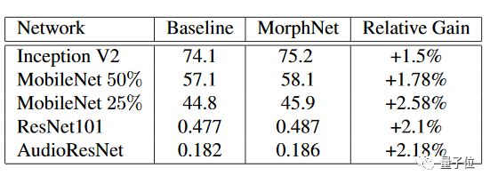 在对Inception V2的优化上MorphNet表现出色,对于其他的网络模型,MorphNet也同样好用。