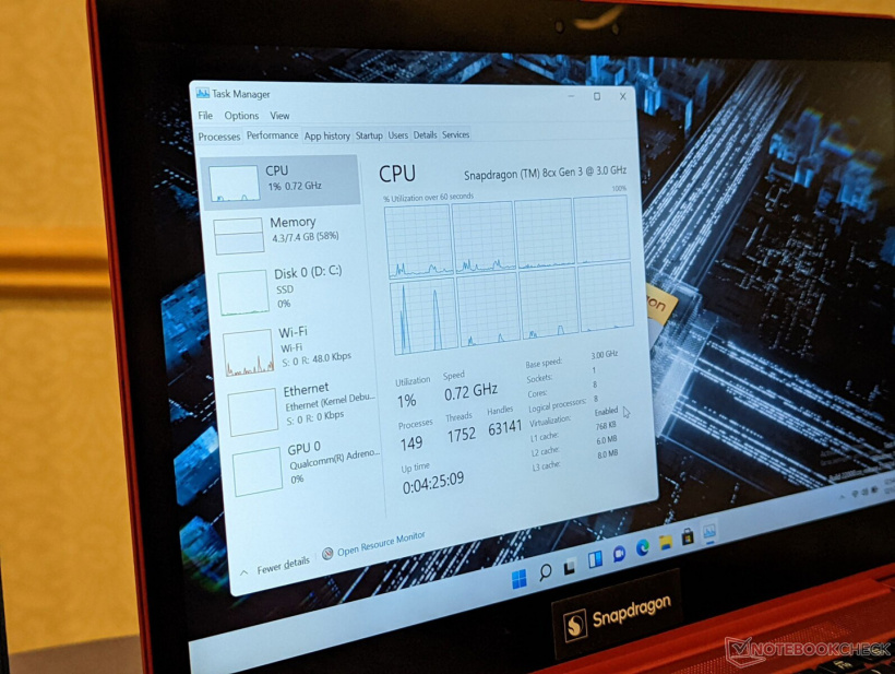 据外媒 NotebookCheck 报道,今日高通发布了针对笔记本电脑等平台设计的骁龙 8cx Gen 3 SoC 芯片,这款芯片可以应用于笔记本、平板电脑等设备,采用 5nm 制程工艺,预计由三星电子代工制造。拥有多达四颗 Cortex-X1 超大核,主频 3.0GHz,TDP 约为 15W。随后, NotebookCheck 就展示了搭载骁龙 8cx Gen 3 的笔记本实拍图。