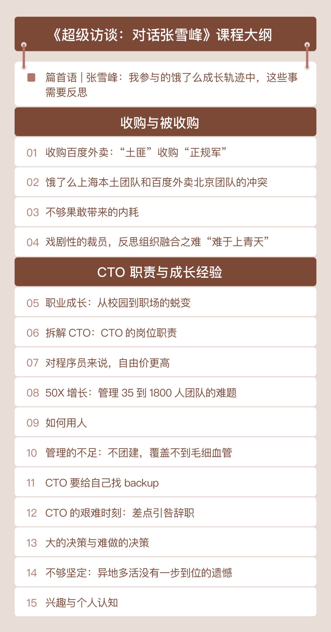 要知道近 1 年张雪峰已经处于“半归隐”状态(饿了么并入阿里 2 年后离职,也不再接受采访),这些一手的经验实在是难得可贵,所以第一时间,我就去极客时间上读了《超级访谈:对话张雪峰》专栏,只能说,大佬不愧是大佬。